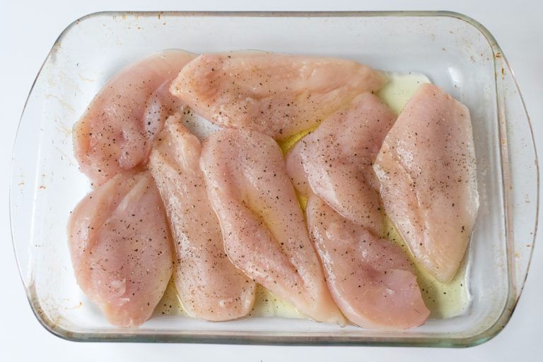 3. Sprinkle a casserole with a couple of olive oil tablespoons. Slice the chicken breasts in half to open them and cover the bottom of the casserole with them. Season with salt and pepper. Cook in the oven for 10 minutes.